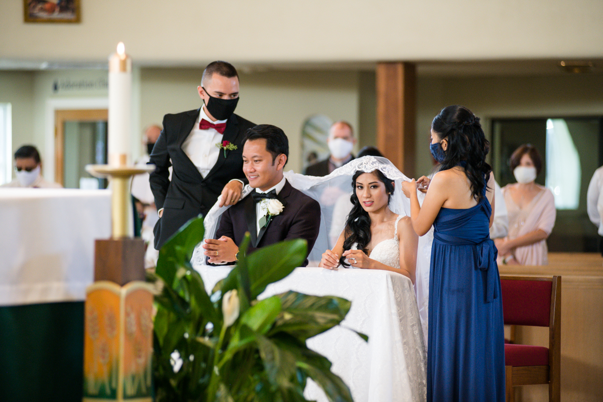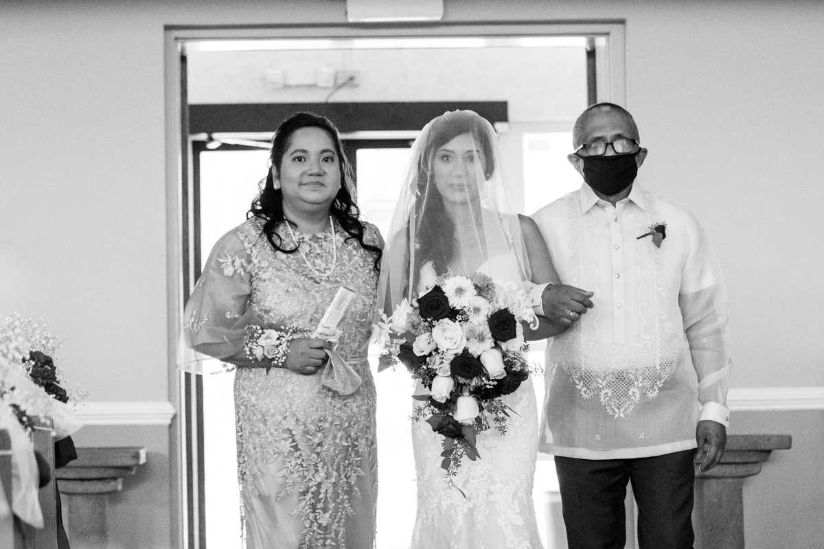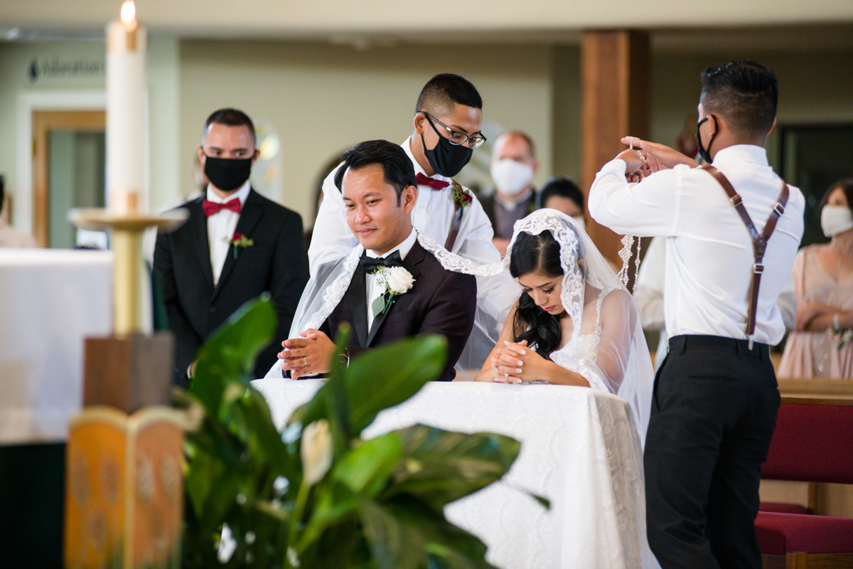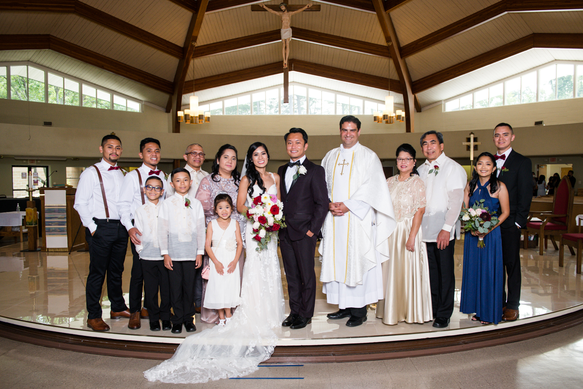 Ed and Liza had a Catholic mass at their family’s church, Immaculate Heart of Mary in Lexington Park, Maryland. Their ceremony also included cultural traditions which we love. Liza and Ed honored their Filipino heritage with a veil and cord custom. A veil is draped over the couples followed signifying they are now one. Followed by a cord loosely placed around the necks of the couple creating a figure-eight. The symbolic meaning is a lifelong bond and fidelity between the couple. They also had the 13 Arras, coins brought to the altar. This custom signifies the groom promising welfare (prosperity) to his future wife and family.