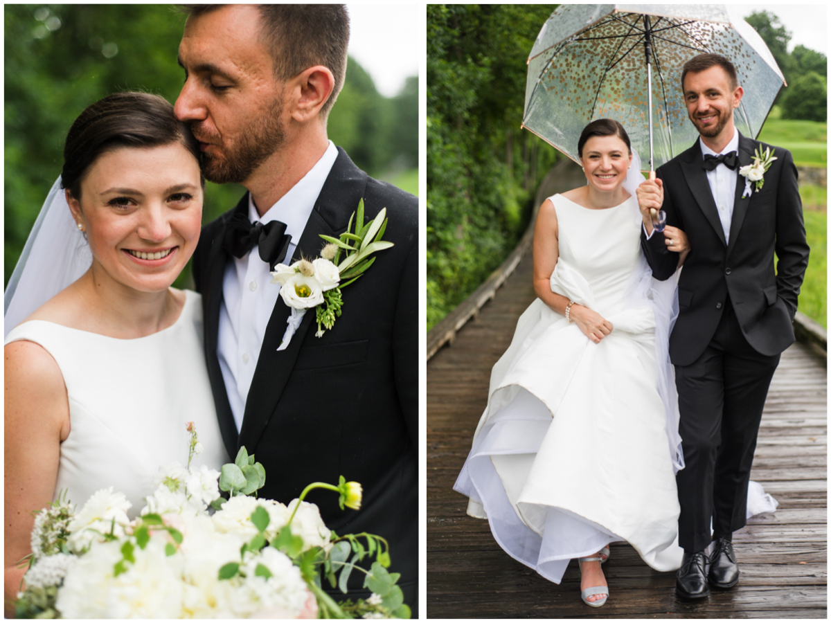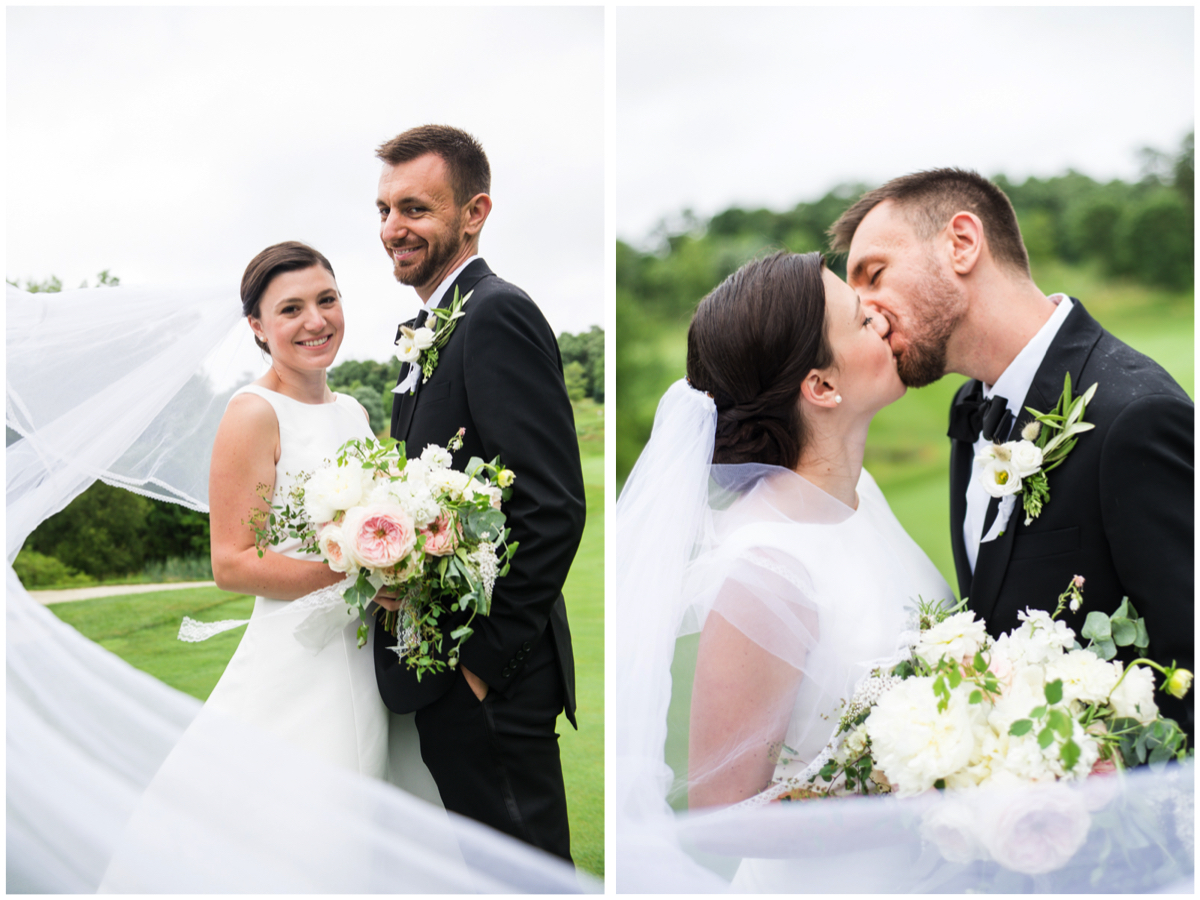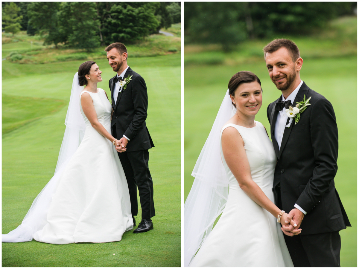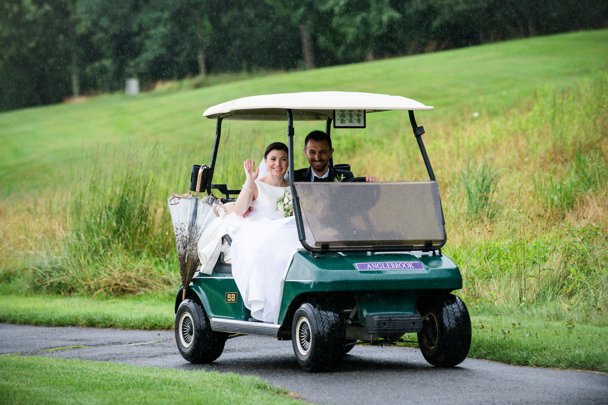 Afterwards, the couple’s reception was held at Anglebrook Golf Club. For cocktail hour, drinks and hors d’oeuvres were served in the lobby of the venue and the adjacent outside patio.A formal dinner followed and was held in the club’s beautiful dining room.  We rode around via a covered golf cart to selected spots on the golf course to capture bride and groom photos. The course green was so vivid under the moody clouds. We love the way their photos came out.