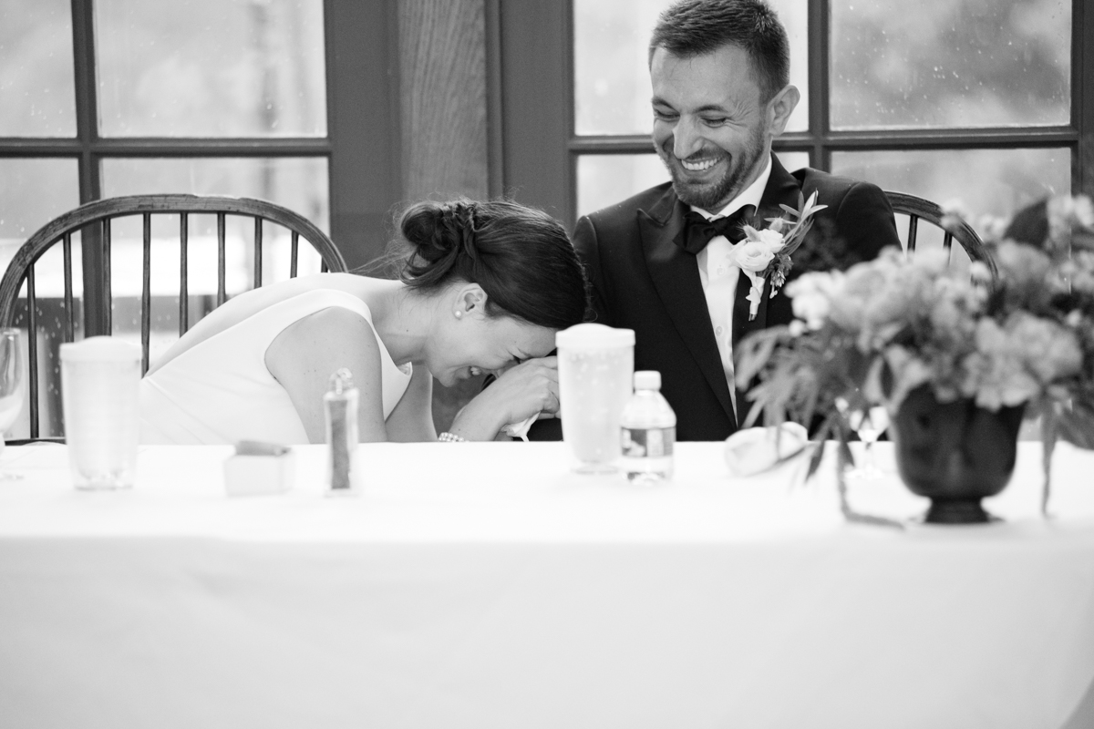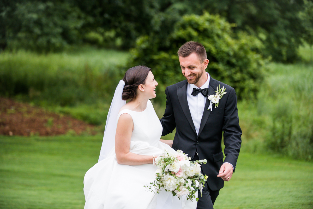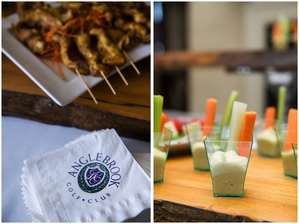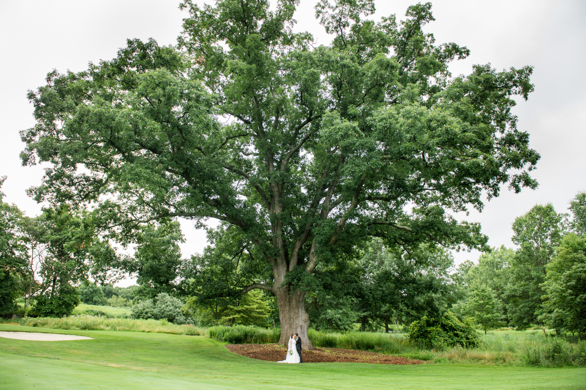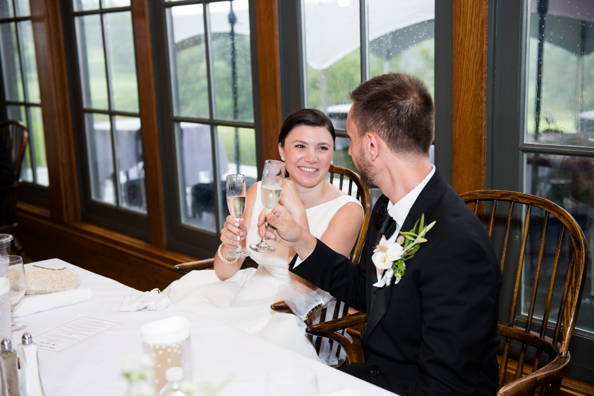 Afterwards, the couple’s reception was held at Anglebrook Golf Club. For cocktail hour, drinks and hors d’oeuvres were served in the lobby of the venue and the adjacent outside patio.A formal dinner followed and was held in the club’s beautiful dining room.  We rode around via a covered golf cart to selected spots on the golf course to capture bride and groom photos. The course green was so vivid under the moody clouds. We love the way their photos came out.