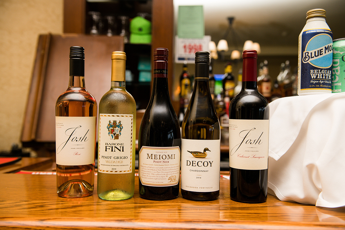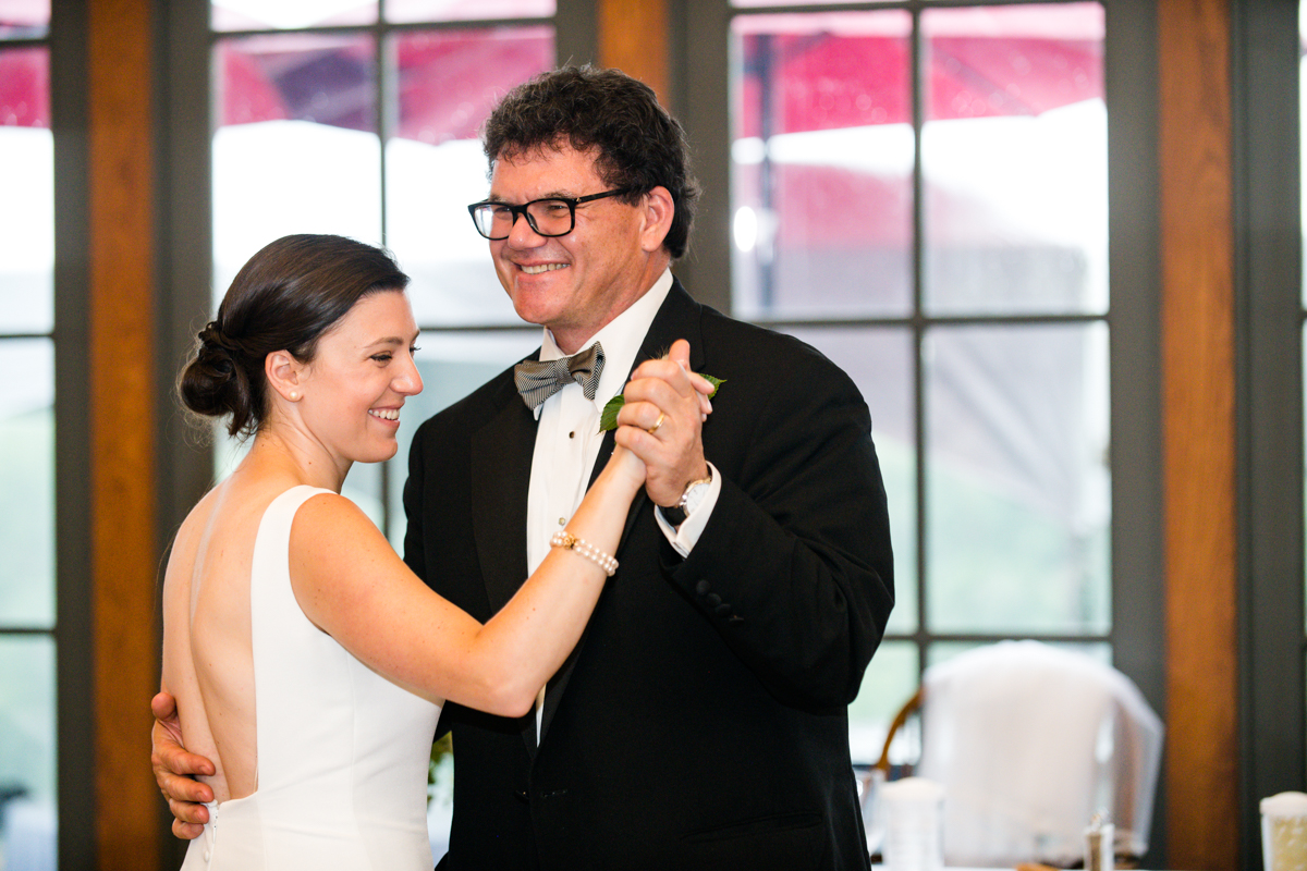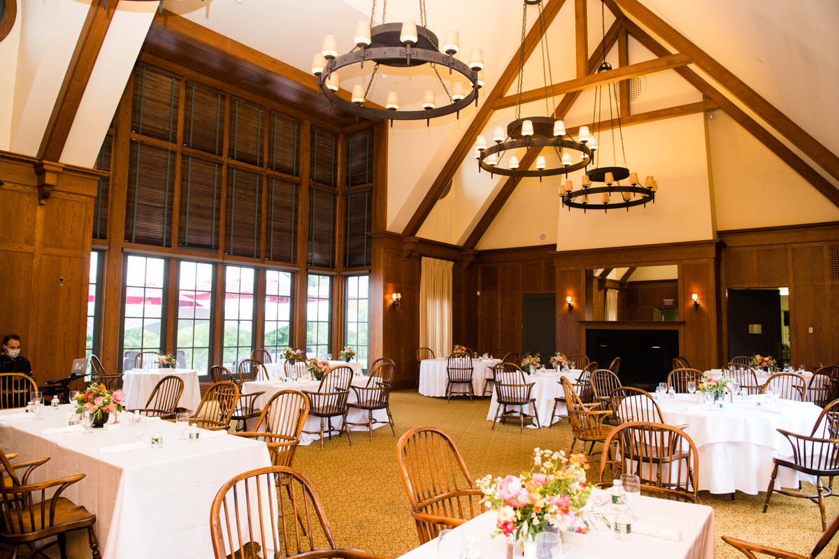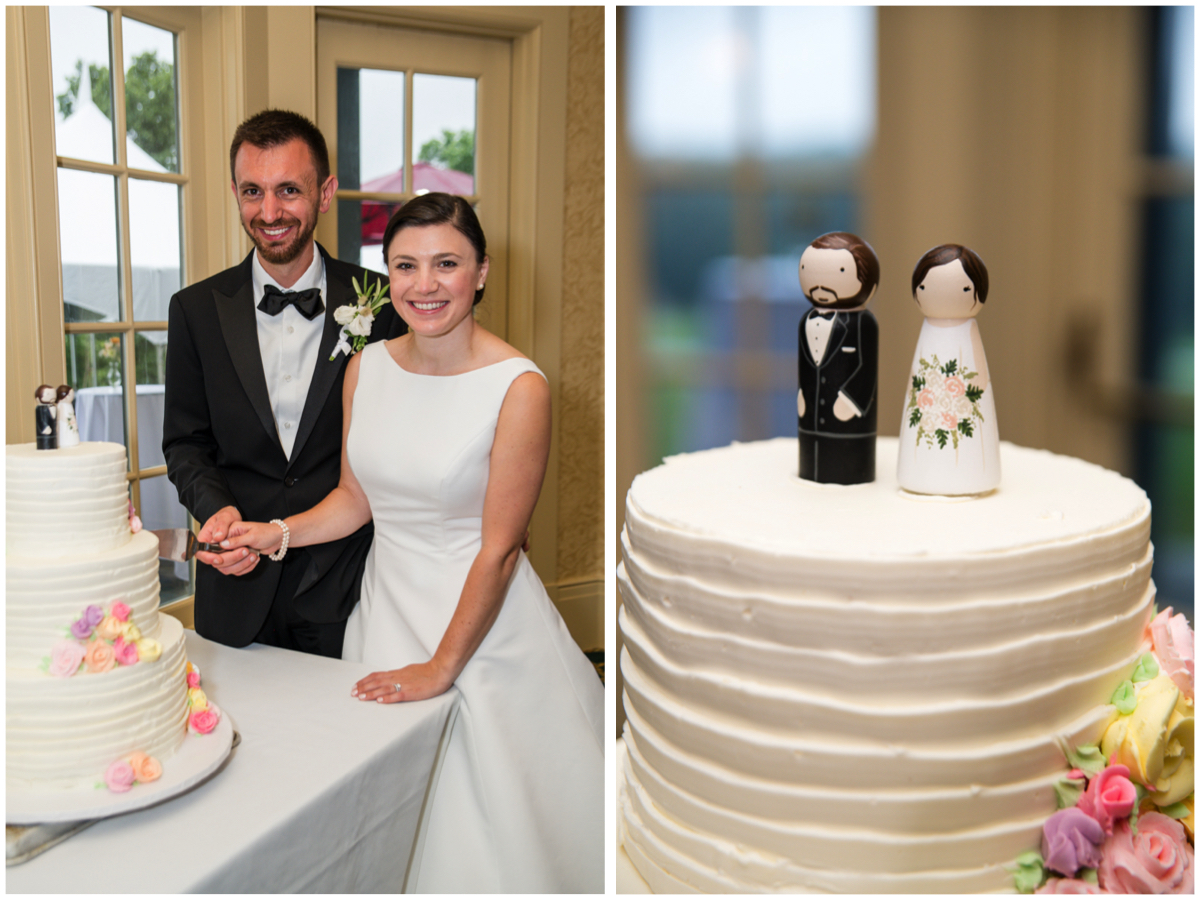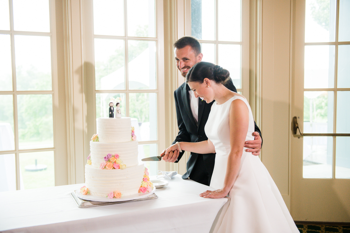 Afterwards, the couple’s reception was held at Anglebrook Golf Club. For cocktail hour, drinks and hors d’oeuvres were served in the lobby of the venue and the adjacent outside patio.A formal dinner followed and was held in the club’s beautiful dining room.  We rode around via a covered golf cart to selected spots on the golf course to capture bride and groom photos. The course green was so vivid under the moody clouds. We love the way their photos came out.